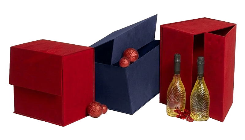 Scatole automontanti con chiusura a calamita rivestite in carta floccata. Perfette per valorizzare i tuoi prodotti o creare confezioni regalo raffinate dando un tocco di lusso al tuo packaging.